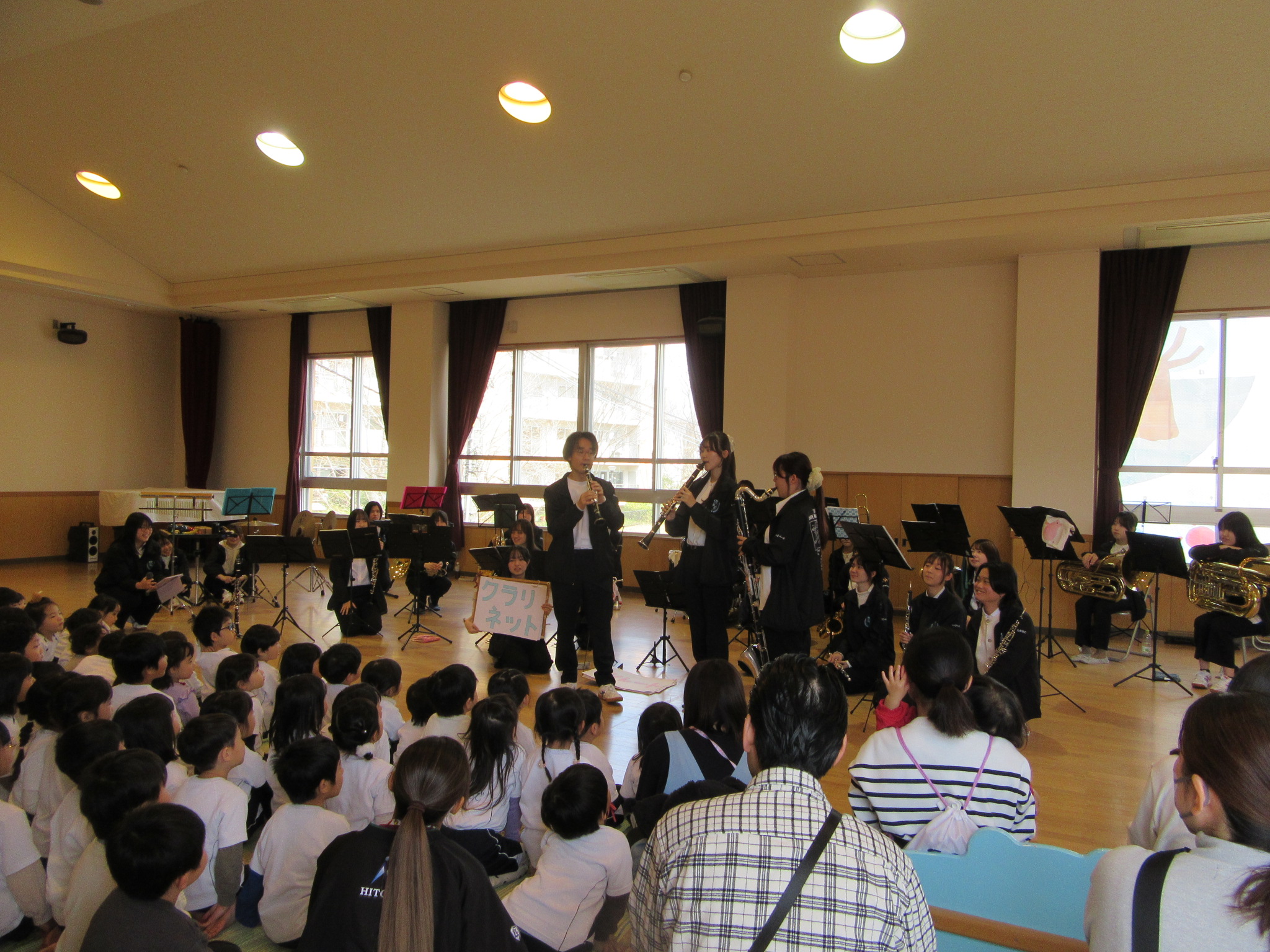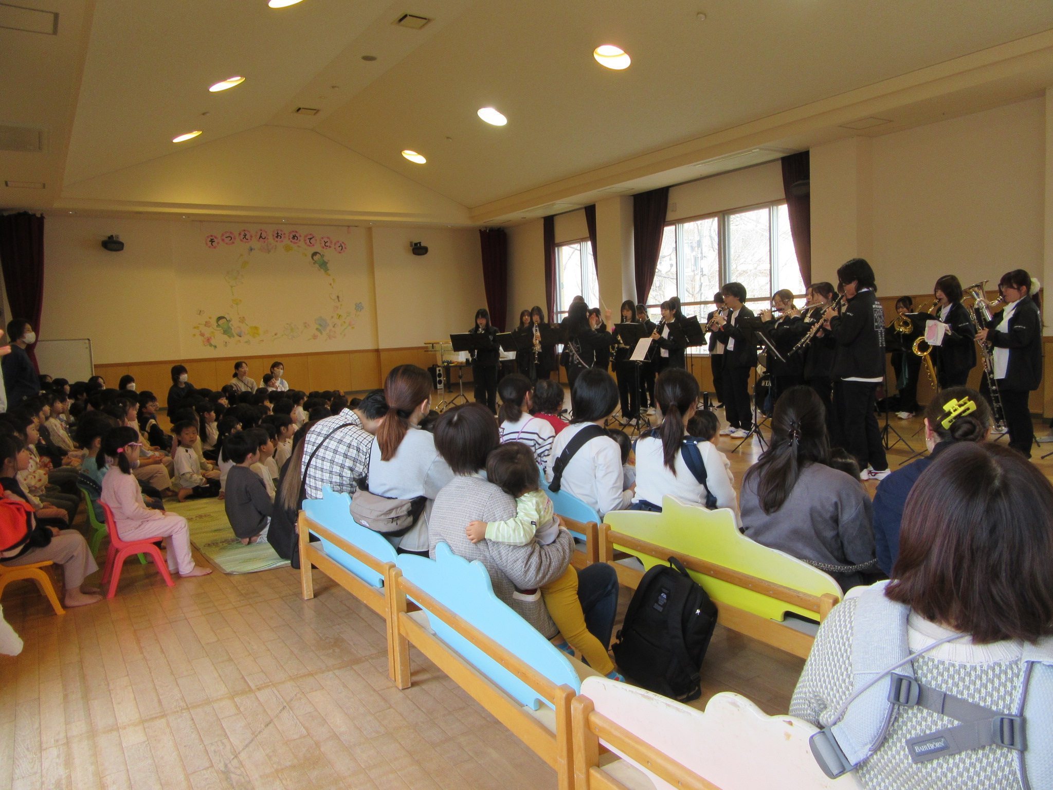 ウインドアンサンブルコンサート 先日中登美こども園ホールにて、 奈良教育大学ウインドアンサンブルコンサートが 開催されました。 会場には優しい楽器の音色が広がり親子で リズムに合わせて体を揺らしたり、 手拍子をしたりと自然と笑顔があふれていました。 となりのトトロのさんぽが流れると こども園のお友達みんな大合唱です♪ 楽器紹介コーナー♪ 音楽を通して親子のふれあいが深まり 会場全体が一体となって 楽しめる素敵な時間となりました。