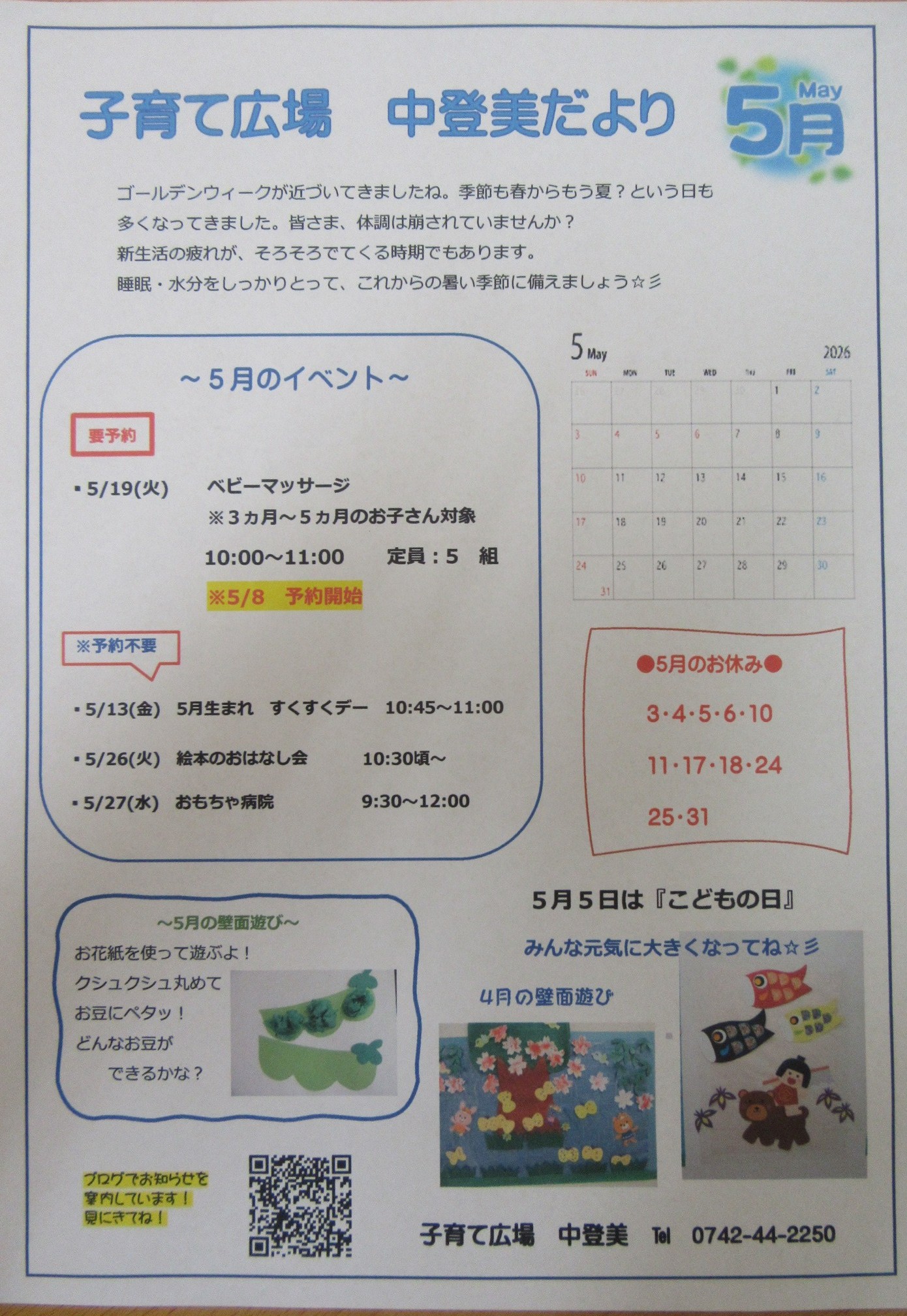 5月中登美だより 日中は少し汗ばむほどに暖かい季節になりましたね。 4月からの新生活、そろそろ慣れてこられた頃でしょうか? 中登美に遊びに来られた時には、お話を聞かせてくださいね♪ 今月の壁面遊びは、お花紙を使ったお豆さん作りです!クシュクシュしに来てね~☆