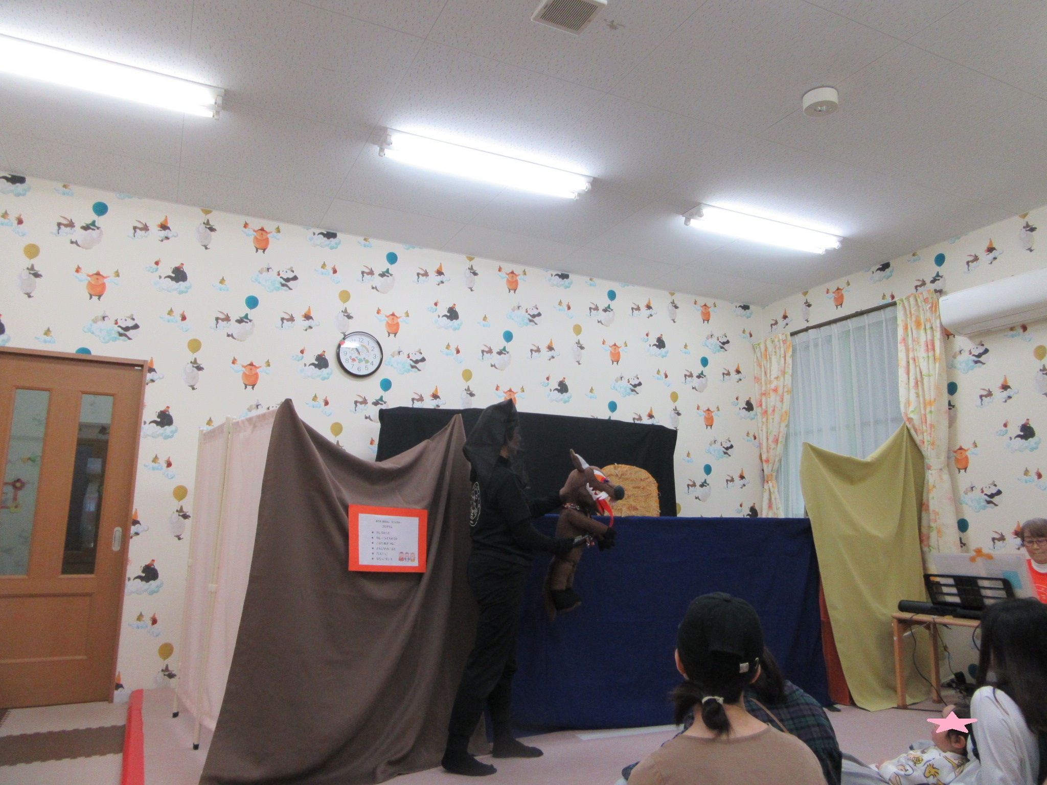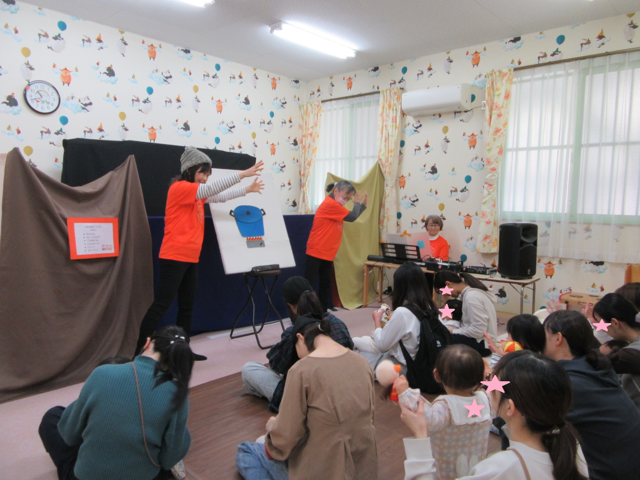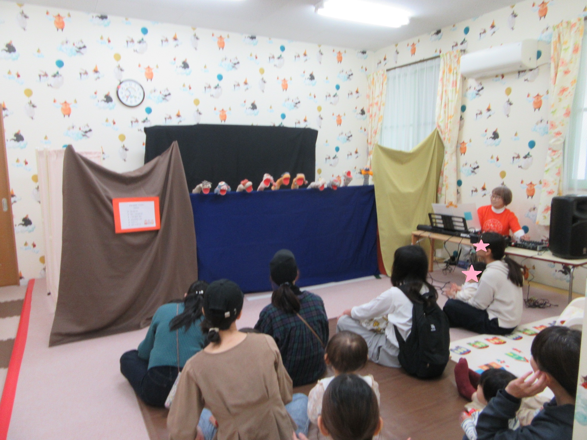 遊びの時間では「おおきなたいこ」などのふれあい遊びや、「おべんとうバス」のパネルシアターを行いました。大きなたいこと小さなたいこの違いを、にこにこ笑顔で楽しんでくれました(^^♪